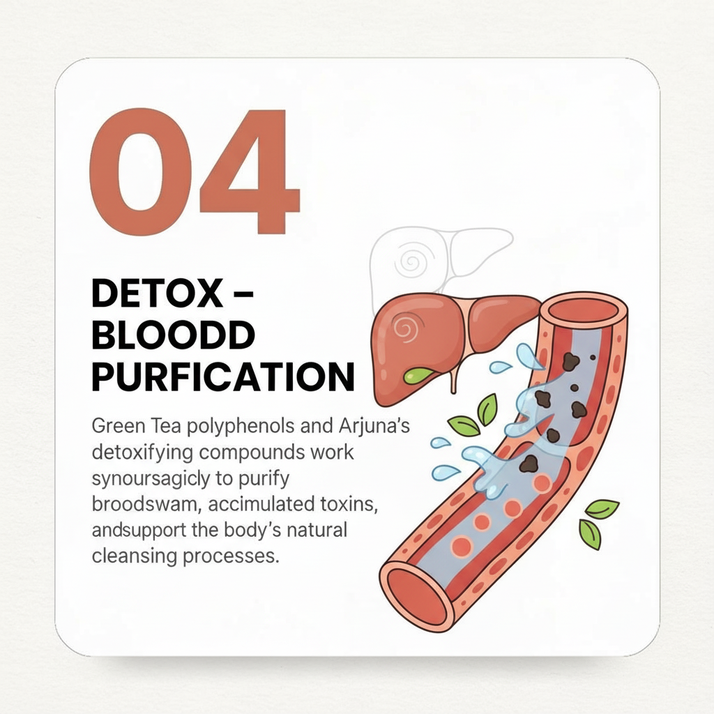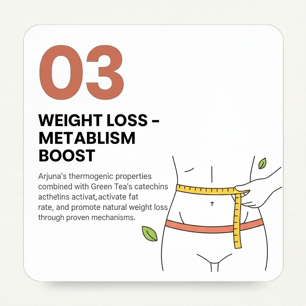 We have fused the legendary "Guardian of the Heart" (Arjuna Bark) with the fat-burning power of Green Tea and the stress-relief of Ashwagandha. This triple-action blend works to flush toxins, support healthy blood pressure, and ignite your natural weight loss engine.