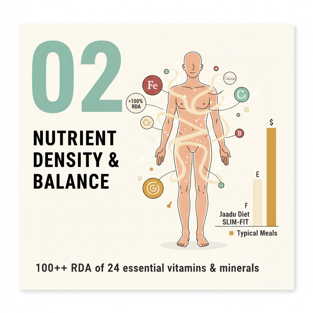 Jaadu Diet Slim Fit Meal Replacement Shake delivers the nutrition of a balanced Indian meal in just 200–300 calories, with more protein, fiber, and 100%+ RDA vitamins and minerals than typical 700–1200 calorie meals—developed by Dr. Bimal Chhajer, | 1